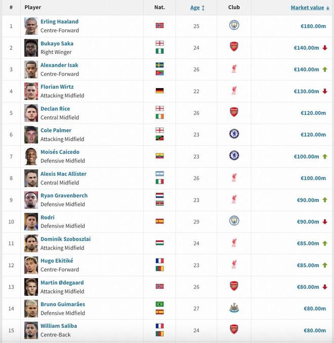阿森纳球员身价变更:萨卡跌至1.4亿欧,厄德高下跌500万欧